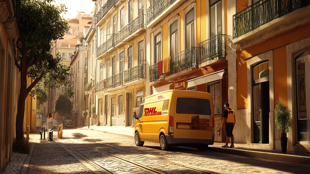 A highly realistic scene of a DHL delivery van parked on a busy avenue in Lisbon, Portugal, as a courier in uniform steps out to deliver a package to a local business. The iconic architecture of Lisbon is visible, with traditional Portuguese buildings, tiled façades, and street details like cobblestone sidewalks and tram tracks. The van is branded with the DHL logo, and the street is bustling with pedestrians and light traffic. The atmosphere is bright and sunny, with shadows cast by the buildings and trees along the avenue, capturing the vibrant city energy. --ar 16:09PROMPT DO DIA
