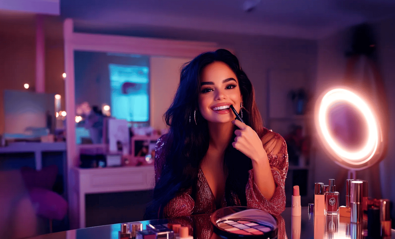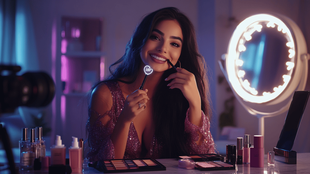A beautiful portuguese female beauty influencer sits elegantly at a modern vanity table, holding 'like' icon in one hand and a makeup brush in the other. She smiles confidently, surrounded by an array of beauty products, including lipsticks, eyeshadow palettes, and skincare bottles. The table reflects the soft glow of the studio lighting, while a ring light and camera setup are visible in the background. The scene is set against a chic, minimalist background with pastel tones and high-resolution photography. --ar 16:9