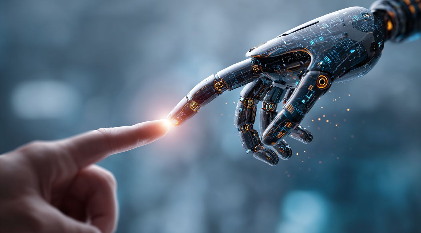 Artificial intelligence robot hand touching a digital screen with a human finger on a blurred background of data and code, an AI technology concept. --ar 16:09PROMPT DO DIA