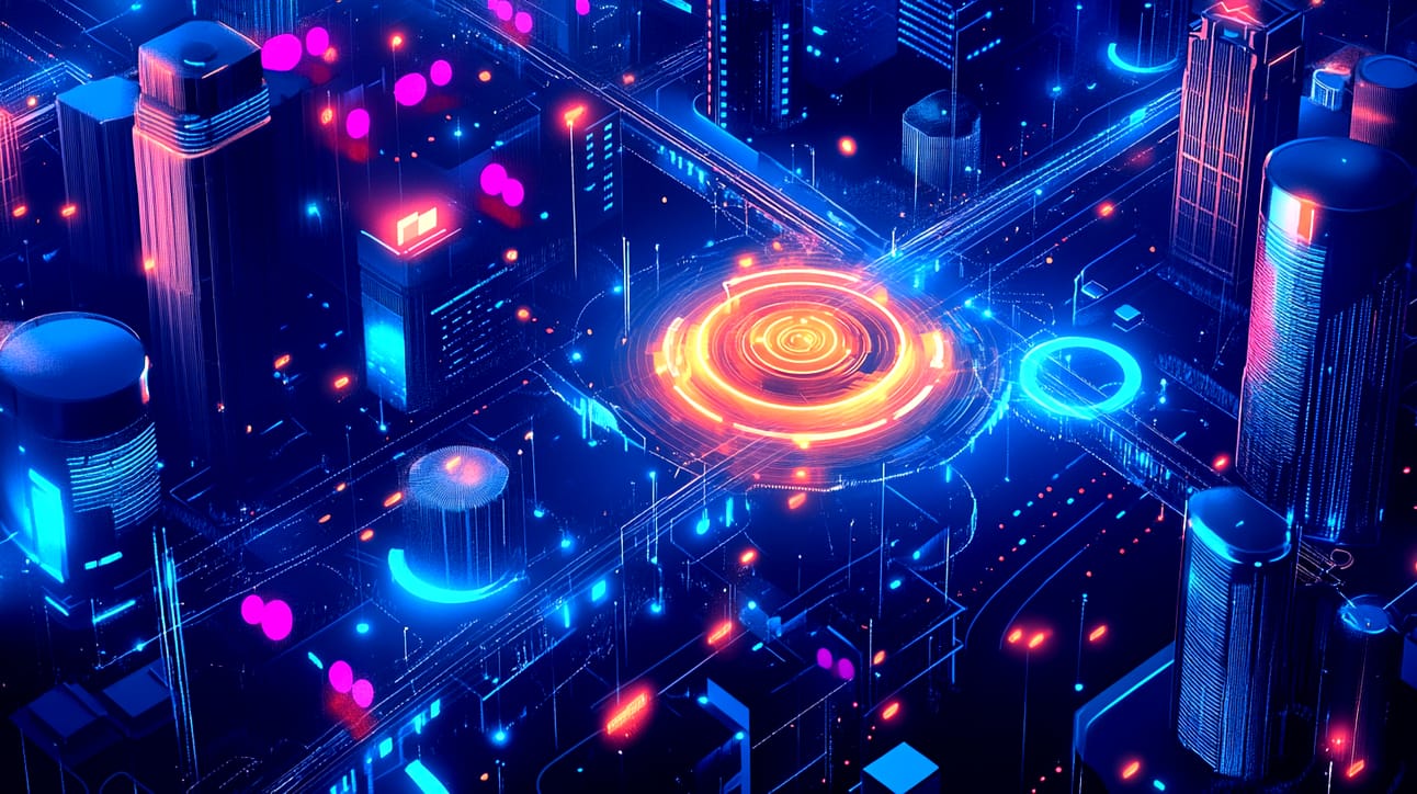 Create a visually striking representation of the modern business world driven by data. Show a futuristic, digital cityscape with streams of data flowing like energy between interconnected departments such as marketing, IT, and eCommerce. In the center, a glowing hub symbolizes the fusion of data governance and data-driven marketing. Surround this hub with dynamic elements like segmented customer profiles, predictive analytics, and personalized marketing campaigns. Integrate visual motifs of algorithms, machine learning, and AI, emphasizing their role in scaling capabilities. The scene should evoke the complexity of managing vast amounts of information and the strategic importance of transforming data into actionable insights for businesses. --ar 16:09 PROMPT DO DIA